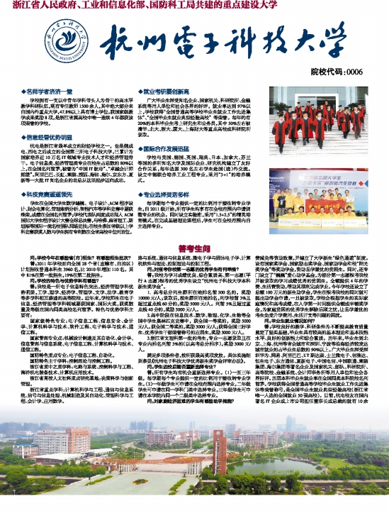 杭电是浙江省最早成立的财经学校之一,也是继成电、西电之后成立的全国第三所电子科技大学,已累计为国家培养近10万名IT领域专业技术人才和经济管理骨干。电子信息类、经济管理类专业在校生占总数的80%以上,在全国名列前茅,被誉为“中国IT航母”、“卓越会计师摇篮”。阿里巴巴、长虹、熊猫、搜狐、海信、海尔、京东方、夏新等一大批IT知名企业的老总从这里起步迈向成功。