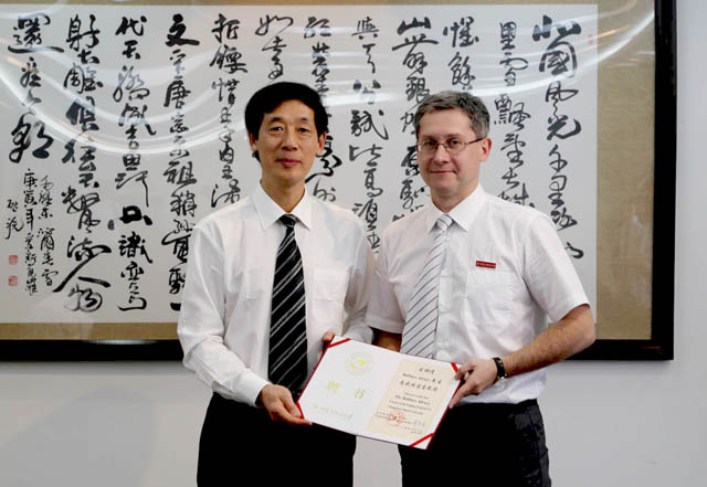 4月15日下午,学校举行客座教授聘任仪式,校长薛安克为波波索夫教授、车宾斯基博士、阿兰诺夫斯基博士和贝尔金博士颁发客座教授聘书,并佩戴校徽。副校长胡华代表学校致辞,国际交流合作处、人事处、自动化学院相关负责人及合作研究团队代表等参加。
