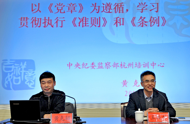 12月25日下午,中央纪委监察部杭州培训中心主任助理黄克招应邀来校,作了题为“以《党章》为遵循,学习贯彻执行《准则》和《条例》”的专题辅导报告。在校校领导、校纪委委员、全体党员中层干部、教工党支部书记等200余人参加报告会。报告会由校党委书记王兴杰主持。