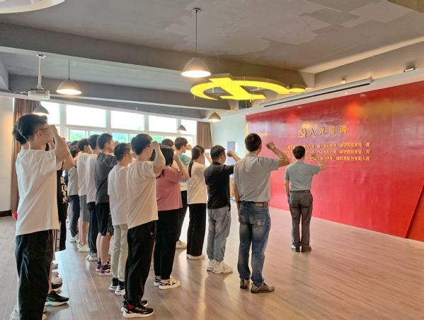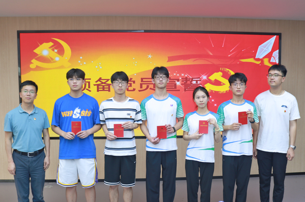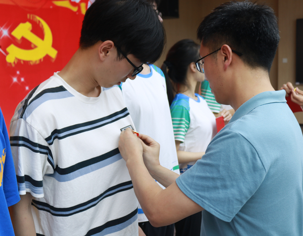 通信工程学院新发展党员入党宣誓仪式在《国际歌》声中开始,院党委书记何宏作为领誓人带领全体预备党员和党员行政干部在入党誓词前表达初心和对党的庄严承诺,与会全体党员同志再一次重温了入党誓言。随后,何宏为全体新发展党员代表佩戴党员徽章并赠送《中国共产党章程》。