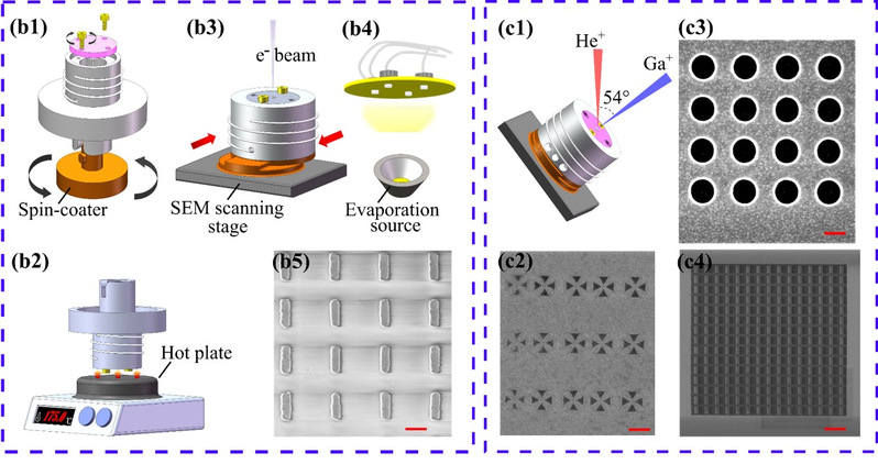 如图1所示,合作团队开发了在单模光纤跳线端面集成微纳功能结构的一整套加工工艺:电子束曝光(EBL),聚焦离子束刻蚀(FIB),旋涂、物理蒸镀等。利用这套工艺,能够在直径为9um的光纤纤芯区域以较高的稳定性和精确度实现多层无源和有源光电子器件的精准集成。