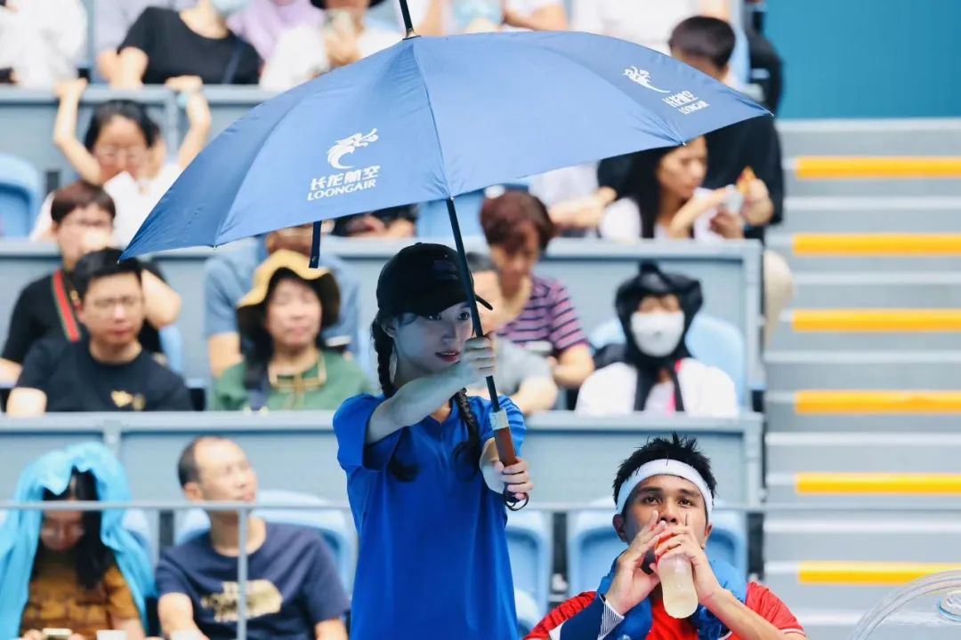 不仅要捡球,有时球童还会为运动员打伞。虽然已经进入9月下旬,但杭州的天气仍有些炎热。赛场上的球童却依然保持着标准的姿态和敏捷的身手,为网球比赛提供一流的服务。