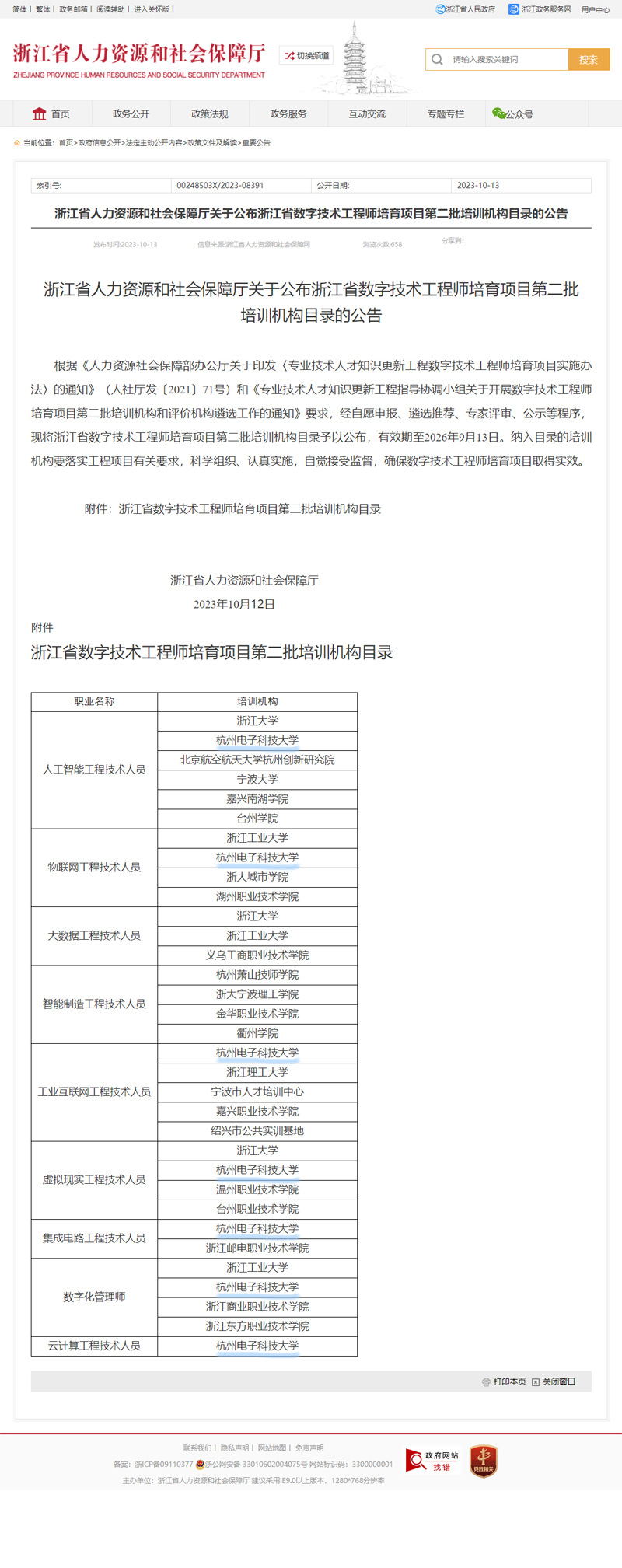 近日,浙江省人力资源和社会保障厅公布了浙江省数字技术工程师培育项目第二批培训机构目录,我校在人社部第二批数字技术工程师培训机构遴选中取得突破性进展,一举斩获人工智能、物联网、工业互联网、虚拟现实、集成电路、数字化管理师、云计算共七个方向的培训资质。加上首批入选的大数据方向,我校已拥有全部培训方向(共十个)中的八个,成为浙江省内数字技术工程师培育项目培训方向最齐全的高校,也是目前国内培训方向最齐全的培训机构之一。