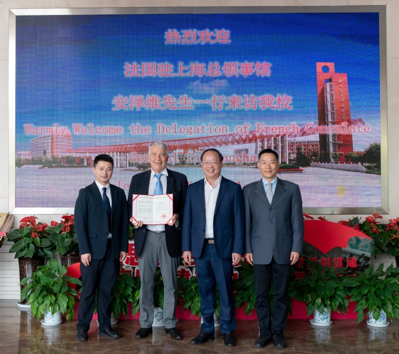 10月30日上午,法国驻上海总领事馆科技领事安泽维(Xavier Assfeld)一行来我校访问,校长朱泽飞、副校长杨勇接待了来访嘉宾。来自我校中法合作办学项目合作院校——法国巴黎城市大学(Université Paris Cité)的Vidal教授和王丹萍教授,校科研处、国际交流合作处、自动化学院相关负责人参加了会谈。