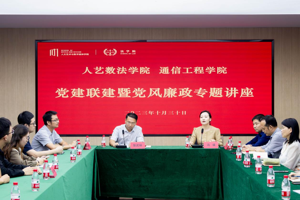 为加强基层党组织建设、创新基层党建工作载体、提高党建工作水平,10月30日下午,人文艺术与数字媒体学院、法学院与通信工程学院在校党建智治中心开展了党建联建暨党风廉政教育专题讲座活动。人艺数法学院党委书记冯瑛、院长王毅刚、副院长过山、副书记马化龙等班子成员及党委委员、纪委委员、支部书记、研究院院长、数字媒体技术党支部党员代表,通信工程学院党委副书记陈新峰、创新团队党支部支委及党员代表参加了本次活动,活动由人艺数法学院党委书记冯瑛主持。