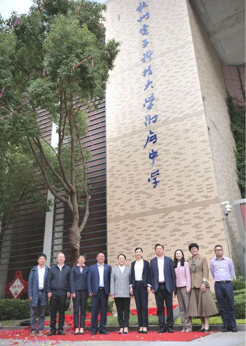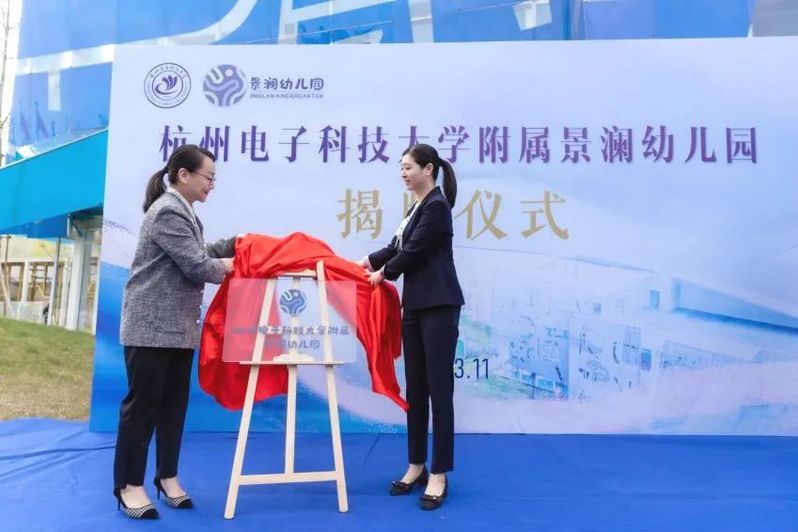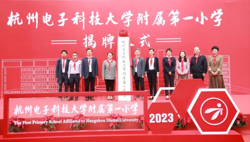 校党委副书记钱波,钱塘新区管委会副主任、钱塘区人民政府副区长潘伟红,为杭电附属第一小学、附属中学、附属实验学校、附属景澜幼儿园揭牌。