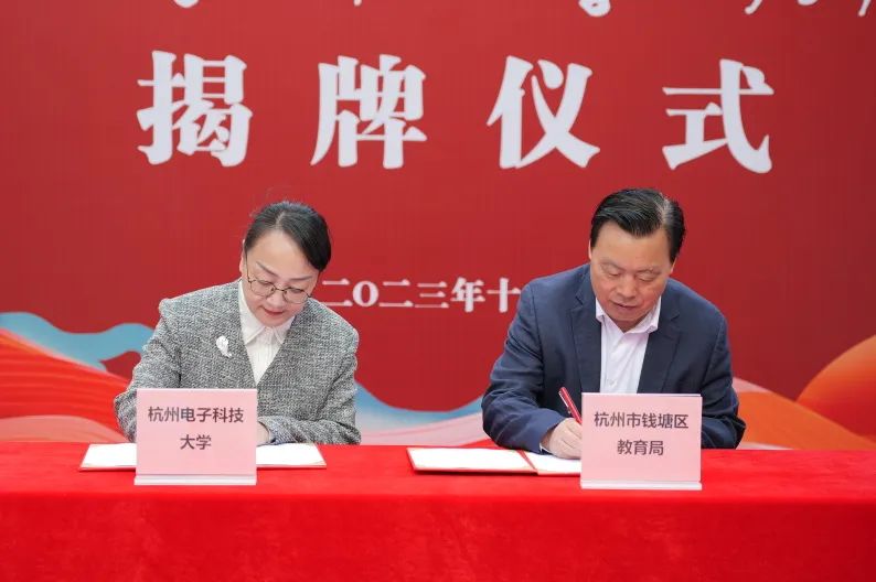 校党委副书记钱波,钱塘区教育局党委书记、局长钱晓华,分别代表学校与钱塘区签署合作共建杭电附属学校战略框架协议签约仪式。