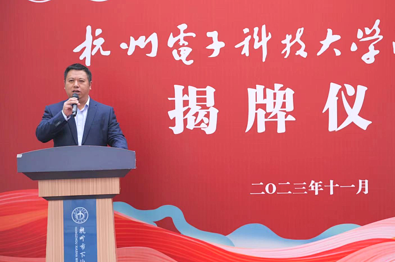 杭电附属中学书记、校长童永圣作表态发言,承诺将紧抓成为杭电附校契机,全心全意办好家门口的好学校。
