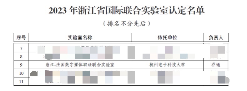 近日,浙江省科技厅发布了《浙江省科学技术厅关于公布2023年度省级国际科技合作载体认定名单的通知》(浙科发外[2023]70号),我校“浙江-法国数字媒体取证联合实验室”被认定为浙江省国际联合实验室。