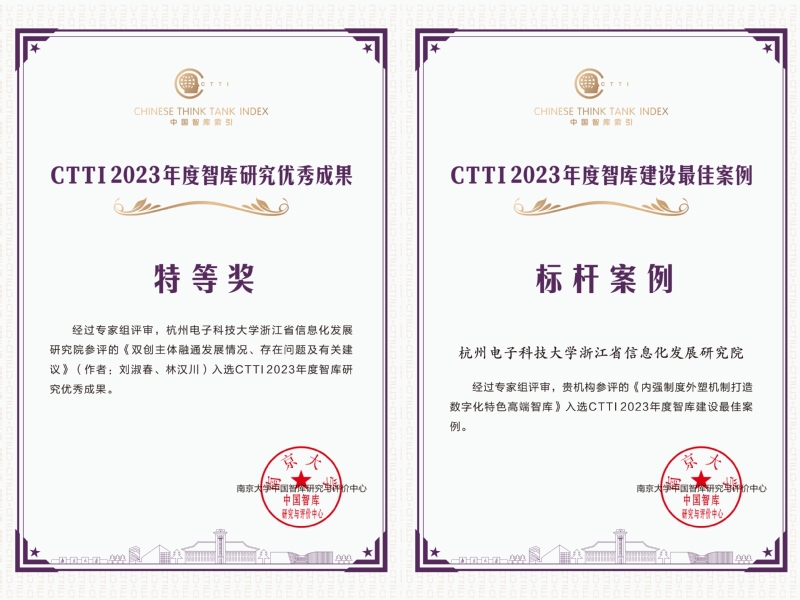 2023年是智库建设5年的验收评估年,通过对决策影响力、社会影响力、学术影响力、国际影响力以及未来发展潜力等方面的认真总结,根据浙江省教育厅公布的浙江省新型高校智库的绩效评估结果,久久精品一区二区信息化发展研究中心获评为最高等级(A级),智库建设质量和发展水平在全省高校智库中名列前茅。同时,研究院顺利通过了浙江省社科联组织的浙江省新型智库建设期满评估。