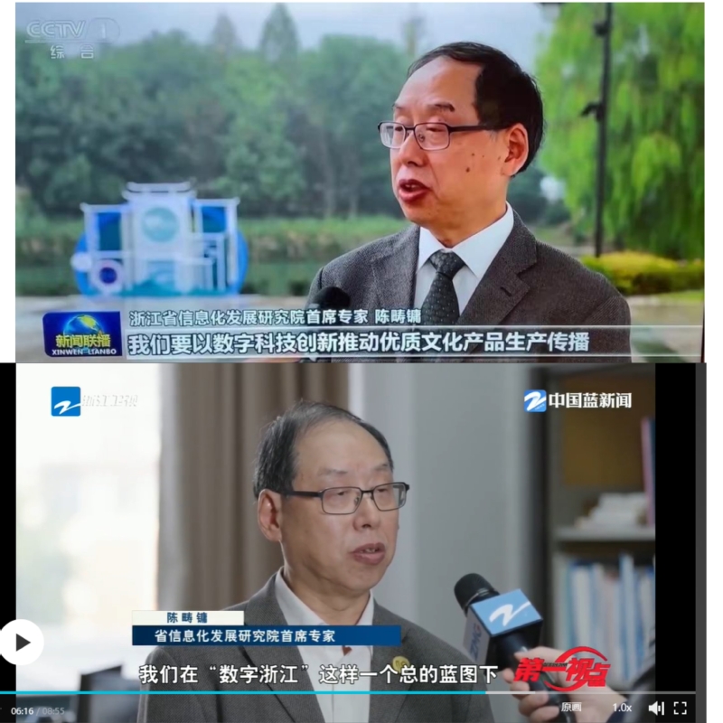 研究院研究团队多次在中央电视台、浙江卫视等主流媒体发声。3月31日,浙江召开全省数字经济创新提质“一号发展工程”大会,受新华网邀约,研究院首席专家陈畴镛教授作了观点分享,全网阅读量81万+。11月9日,陈畴镛教授接受了中央电视台《新闻联播》和《人民日报》专访,就学习习近平主席在2023年世界互联网大会乌镇峰会开幕式视频致辞“三个倡导”中关于文明互鉴论述发表观点。陈畴镛教授5次在浙江卫视《新闻联播》就数字经济高质量发展等主题发表专家点评,此外,多次在《潮新闻》客户端、杭州电视台《我们圆桌会》、杭州之声《财经快评》系列节目中发表专家观点。12月6日,研究院郑军南博士接受浙江卫视中国蓝新闻专访,就2023年十大流行语的“新质生产力”、“人工智能大模型”发表专家观点。