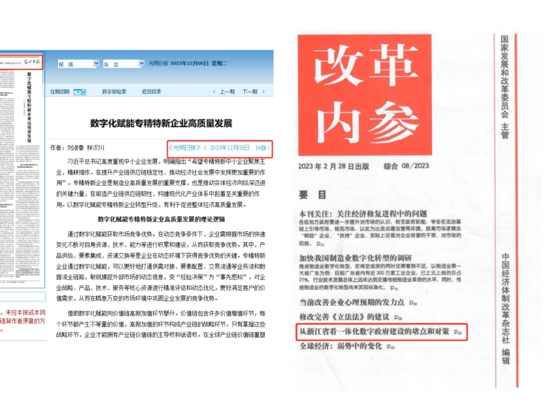 聚焦数字经济、数字治理领域,在光明日报、浙江日报等重要媒体阵地发表理论文章。刘淑春院长等12月5日在光明日报理论版发表的文章《数字化赋能专精特新企业高质量发展》、10月20日发表在中国经济时报的《建设具有中国特色的数据治理体系》,陈畴镛首席专家2月6日和12月18日先后发表在《浙江日报》(理论周刊)的文章《以数字经济赋能中国式现代化浙江篇章》《数字中国的浙江溯源与实践》(后者全网传播量超过25万)以及发表在省委机关刊物《今日浙江》的文章《勇立数字经济高质量发展潮头》,辛金国首席专家发表在《改革内参》杂志的文章《从浙江省看一体化数字政府建设的堵点和对策》等,受到学界和政界广泛关注。