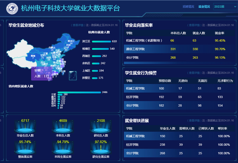 面对2023年就业渠道和岗位的骤减、毕业生人数规模达历史新高、结构性就业难度加大等挑战,学校就业工作结合“线上提质增效、对内优化服务、对外深化拓展”的思路,重点建设“校企联动、校院联合、多跨协同、就业育人”的就业生态系统,夯实就业工作合力,提升就业工作服务力,增强学生就业竞争力,使得数字赋能有新意、推动工作有实效。