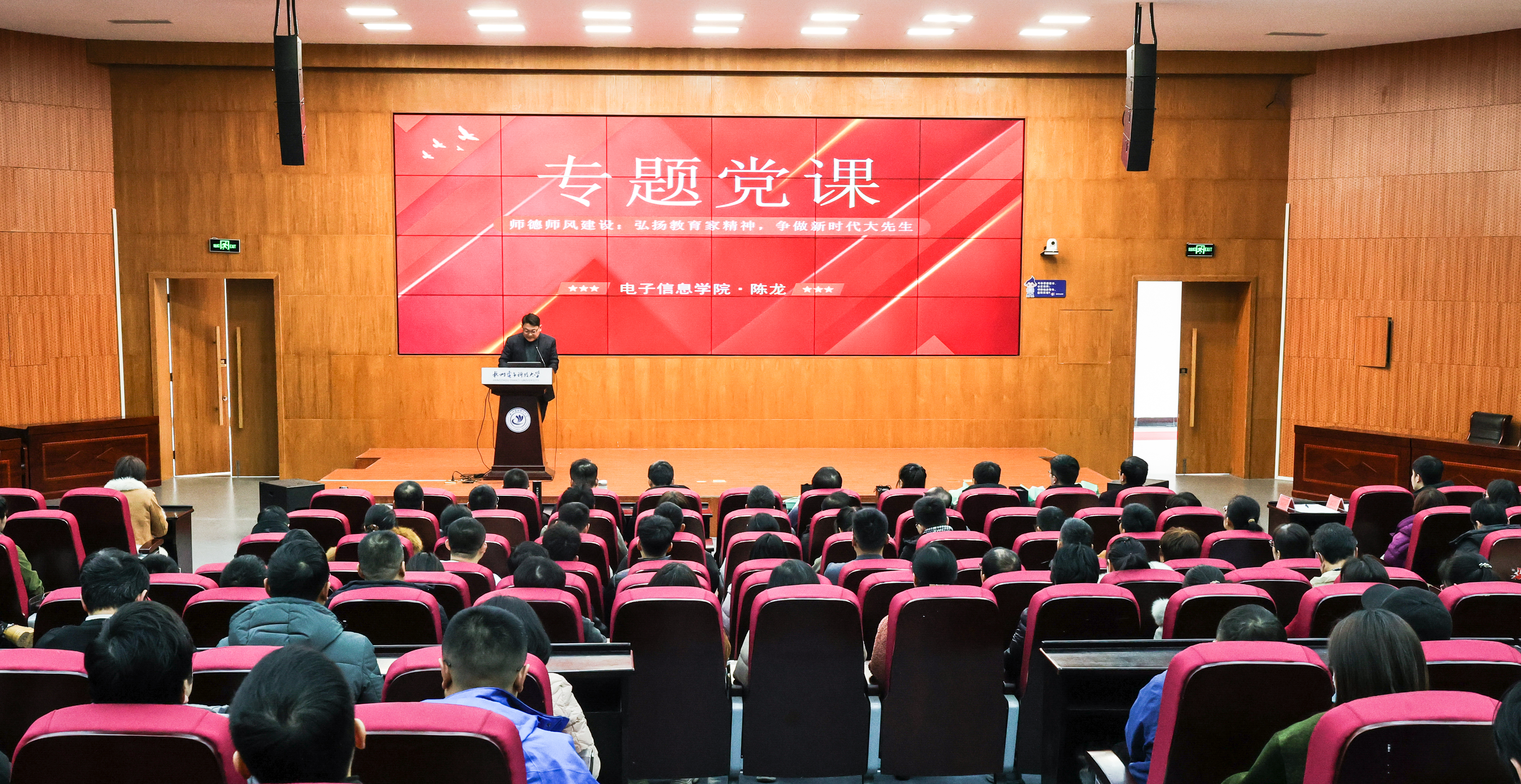 陈龙主持大会并作题为“师德师风建设:弘扬教育家精神,争做新时代大先生”的专题党课,陈龙在党课上领学了习近平总书记近期重要讲话精神,学习了省委“新春第一会”全省持续推动“八八战略”走深走实,全力打造高素质干部队伍、高水平创新型人才和企业家队伍、高素养劳动者队伍大会上省委书记易炼红的重要讲话精神,专题学习全国优秀教师“教育家精神”2024年巡回宣讲的典型事迹。陈龙指出,电子信息学院党委在教师“选育管用”各个环节,把教育家精神的培育和弘扬融入其中,在全院营造一种教育家精神不断闪耀的氛围,让每一位教师都能朝着教育家的目标去努力。