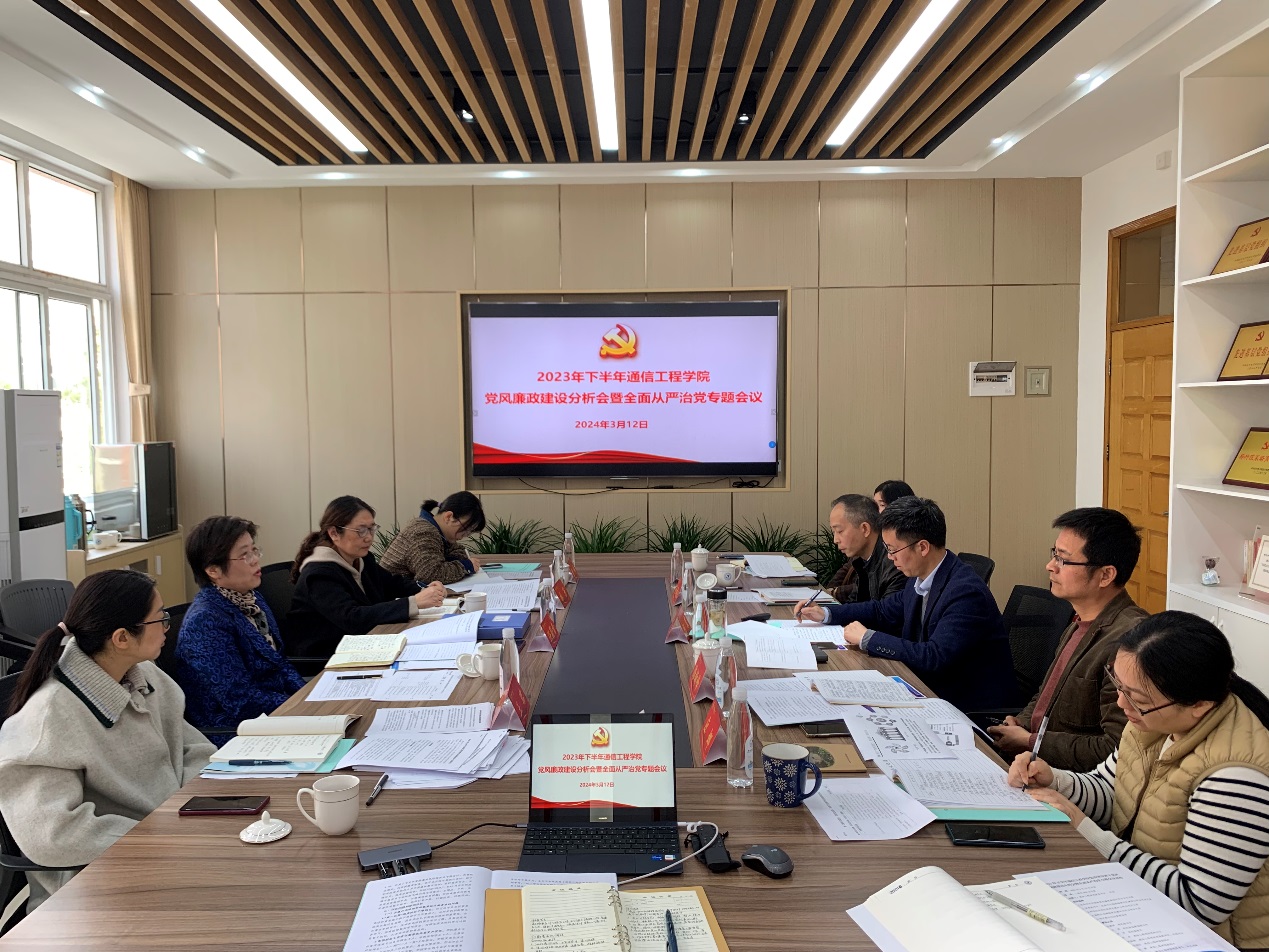 3月12日上午,通信工程学院召开2023年下半年党风廉政建设分析会暨全面从严治党专题会议。会议以习近平新时代中国特色社会主义思想为指导,深入学习贯彻党的二十大精神和二十届中央纪委三次全会精神,贯彻落实省纪委十五届三次全会精神,推动新一届领导班子压实全面从严治党主体责任。校纪委书记任蔚青到会指导,校纪委委员林芳、纪检监察室副主任王珺陪同参会。学院党委书记何宏主持会议,学院领导班子成员、党委委员参加会议。