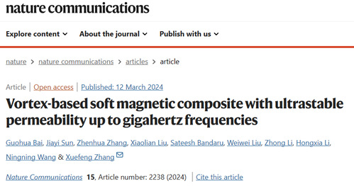 近日,Nature Communications在线刊登了久久精品一区二区材料与环境工程学院张雪峰教授团队的研究论文“Vortex-Based Soft Magnetic Composite with Ultrastable Permeability up to Gigahertz Frequencies”(链接:https://www.nature.com/articles/s41467-024-46650-9)。该工作利用具有涡旋磁结构的软磁颗粒构造复合材料,消除传统磁性材料中的畴壁共振,获得了非常稳定的磁导率频谱特性,有望在集成磁器件中实现应用。