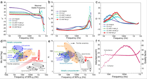 图3(a-c)基于磁涡旋结构的软磁复合材料具有高达GHz的磁导率稳定性(d-e)基于磁涡旋结构的软磁复合材料磁性能和文献报道材料的对比(f)基于磁涡旋复合材料制备的高频电感性能