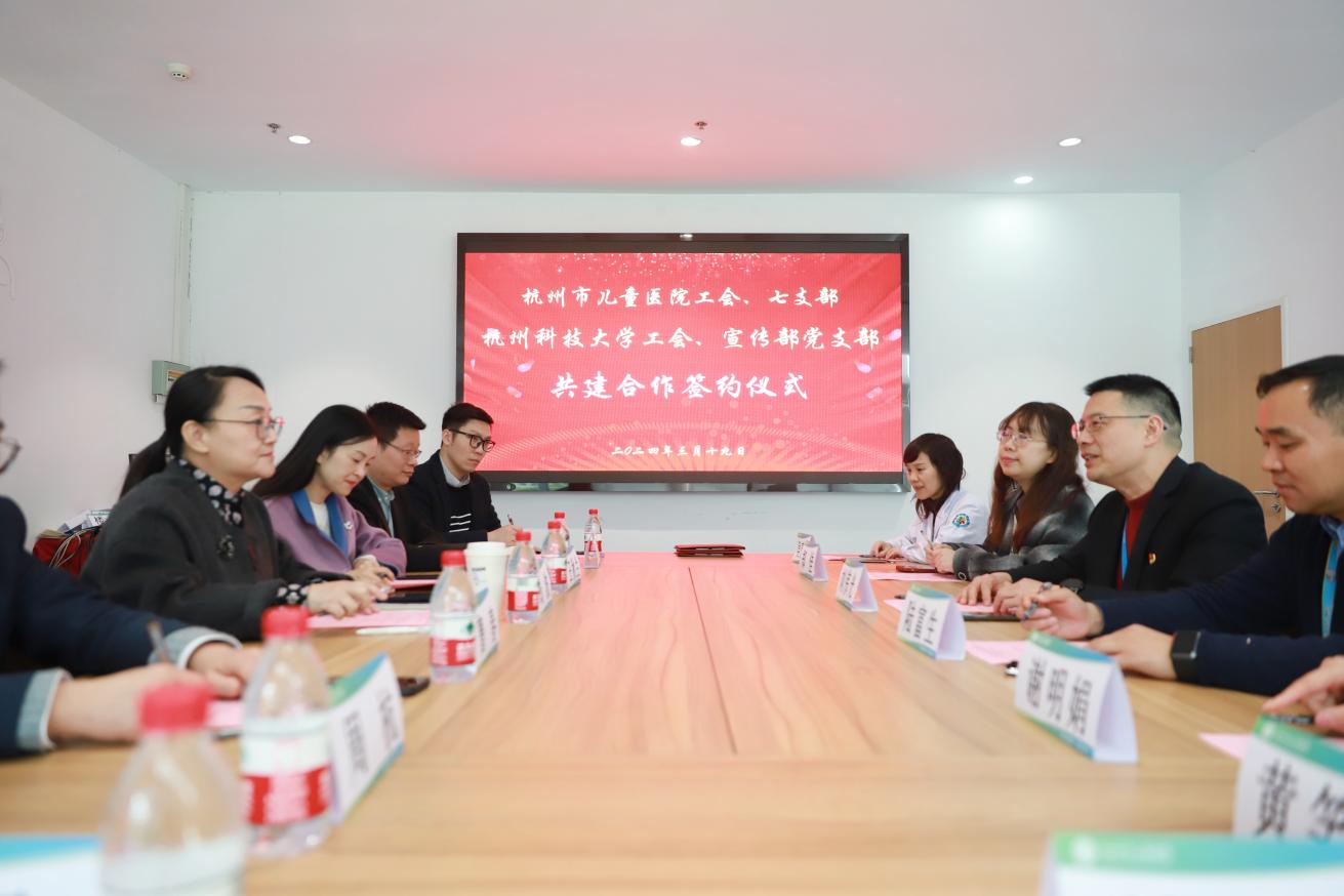 为进一步创新支部党建工作载体,强化校医共建、资源共享、发展共赢,促进党建工作同业务工作深度融合,为教职工提供连续优质的儿童医疗健康服务,切实解决好教职工子女看病难问题,助力“幸福杭电”建设,3月19日下午,校工会、宣传部党支部与杭州市儿童医院工会、第七党支部在杭州市儿童医院举行党建共建合作签约仪式。校党委副书记钱波以及杭州市儿童医院党委副书记、副院长刘伟光,党委委员、健康事业发展部主任陆富生等出席签约仪式。组织部、宣传部、工会、校医院及杭州市儿童医院健康事业发展部、党建办、工会、呼吸科等有关负责同志参加活动。