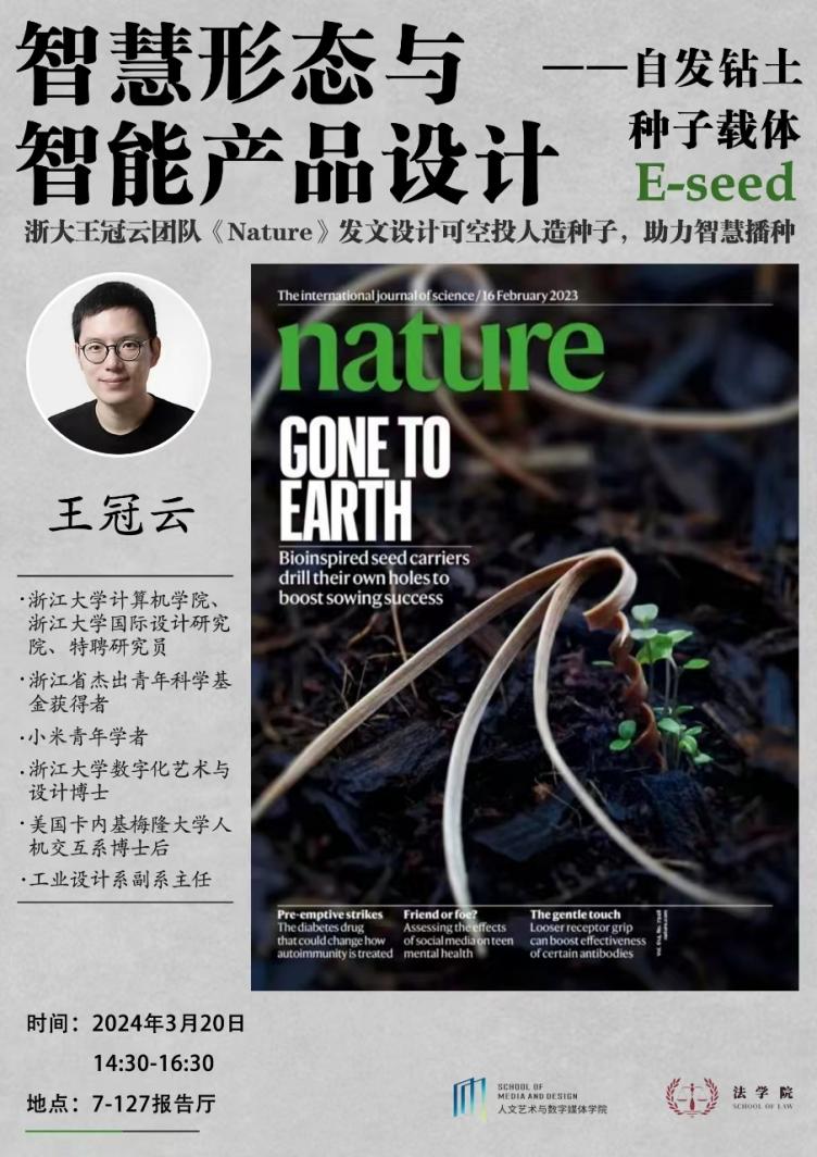 王冠云,浙江大学计算机学院、国际设计研究院特聘研究员、浙江省杰出青年科学基金获得者、浙江大学数字化艺术与设计博士、美国卡内基梅隆大学人机交互系博士后、浙大工业设计系副系主任。王教授团队研究的E-seed在23年《Nature》发文,成果在《Nature》封面全版展示。E-seed将为农业播种、植被播种、环境检测、生态修复提供新思路,探索人类干预种子播种的非自然能力,“可编辑的种子”可能将是媲美“可编辑基因”的下一个热点。