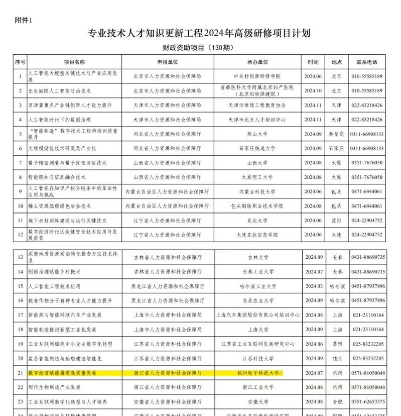 近日,人社部办公厅公布《人力资源社会保障部办公厅关于印发专业技术人才知识更新工程2024年高级研修项目计划的通知》(人社厅函〔2024〕34号),我校申报的“数字经济赋能推进高质量发展”高级研修班经浙江省人社厅推荐,成功入选财政资助项目,这是我校连续四年获批人社部专业技术人才知识更新工程高级研修财政资助项目。 高级研修项目是培养高层次急需紧缺人才的重要抓手,对于支撑引领经济社会高质量发展、推动形成新质生产力具有重要意义。作为国家级专业技术人员继续教育基地,我校始终紧跟人社部知识更新工程的战略布局和工作要求,充分发挥我校学科特长与资源优势,围绕服务国家重大战略、区域协调发展和重点产业发展,不断推出富有学科专业特色和社会影响力的培训项目。