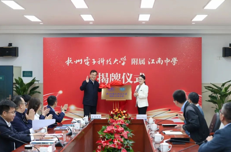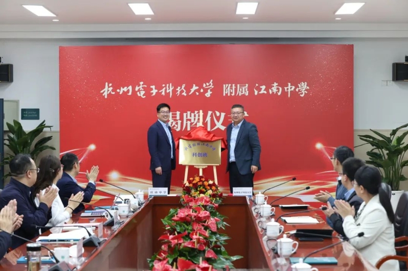 仪式上,钱波与徐松泉为附属中学揭牌,李文钧与周朝勇签订合作共建协议并为杭电科创班揭牌。