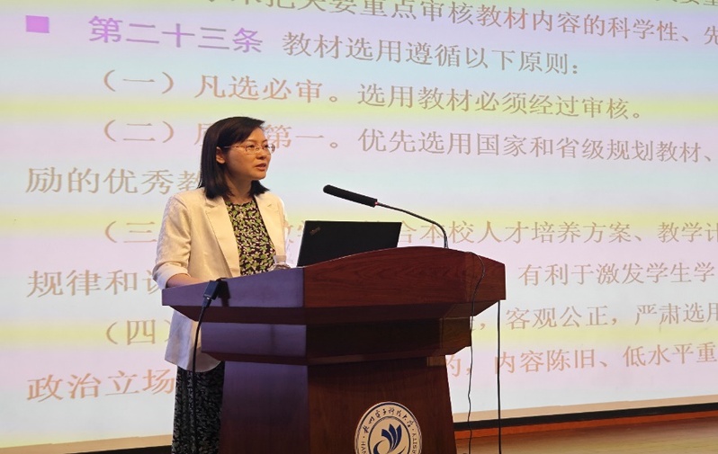 为了扎实做好学校本科教育教学审核评估自评自建工作,5月8日上午,学校邀请浙江大学出版社副社长黄娟琴老师开展“高校教材及教辅资料审核要点”专题培训。学院教材工作组成员、校院两级督导和相关职能部门人员参加了本次培训。会议由教学质量监测与评估中心主任冯忠娜主持。