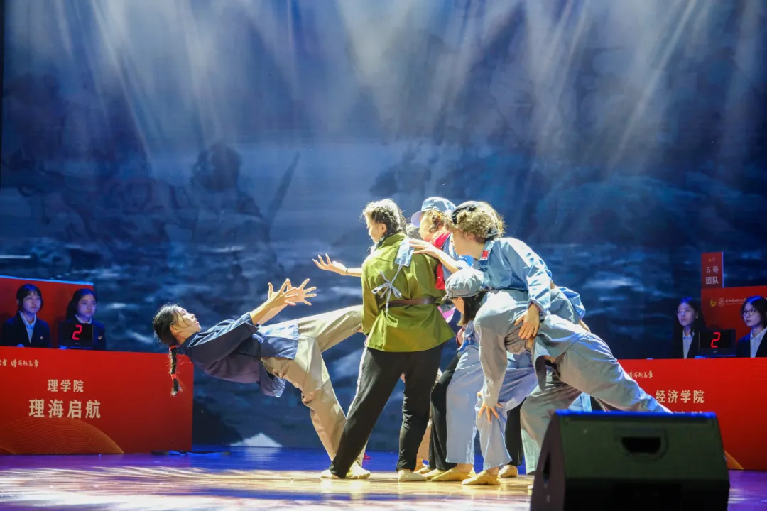 决赛设置了“青春闪耀中国”理论题、“信仰感动中国”剧场题、“理想照耀中国”视频题、“歌声传颂中国”歌曲题、“塑造青年向‘新’力,发展新质生产力”微团课等五个环节。在“信仰感动中国”剧场题环节,校大学生艺术团清影舞队现场演绎舞剧《八女投江》,围绕抗日战争时期东北抗日联军战士英勇奋战的故事进行答题。在“理想照耀中国”视频题环节,聚焦庆祝中国共产党成立100周年主题作品《理想照耀中国》,围绕我国建设发展各阶段国防军工、医疗卫生、乡村振兴等领域功勋人物的丰功伟绩答题。在“歌声传颂中国”歌词接唱抢答环节,校艺术教育中心教师现场领唱《春天的故事》《东方之珠》《新征程》等革命战争和建设时期以及新时代的主旋律歌曲,对参赛团队进行考察。在冠亚季军争夺赛中,选手们以“塑造青年向‘新’力,发展新质生产力”为主题,展示微团课。