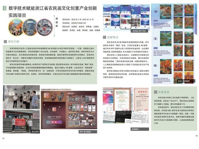 《数字技术赋能浙江省农民画文化创意产业创新实践项目》由人文艺术与数字媒体学院产品设计系副主任张振颖老师指导,余欣悦、熊青榆、王鑫怡、杨壹婷、张琦杭、朱婧、贾俊哲、赵薇、阮勇捷9位学生共同参与完成。项目团队以“艺术赋能乡村振兴”为切入口,聚焦“产业振兴+人才培养+文化共富”重点领域,用设计盘活乡村艺术资源,推动乡村文化共同富裕,探索走出了一条高校艺术设计赋能乡村振兴的新路径。