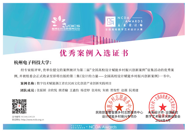 “全国高校设计赋能乡村振兴创新案例”征集是未来设计师﹒全国高校数字艺术大赛(NCDA)“我为乡村做设计”活动的内容之一,由大赛组委会和民政部直管智惠乡村志愿服务中心联合举办,旨在通过征集和推广高校设计创新成果,推动设计力量赋能乡村振兴,助力乡村经济社会发展。大赛得到了“学习强国”学习平台、人民网、新华网、半月谈等媒体的报道和展播。2023第二届“全国高校设计赋能乡村振兴创新案例”共收到全国各学校自愿申报的512个案例,经过多轮评审,其中的150个案例入选,所有入选案例将集结成书——第二集《设计的力量——全国高校设计赋能乡村振兴创新案例集》,由上海交通大学出版社出版发行。