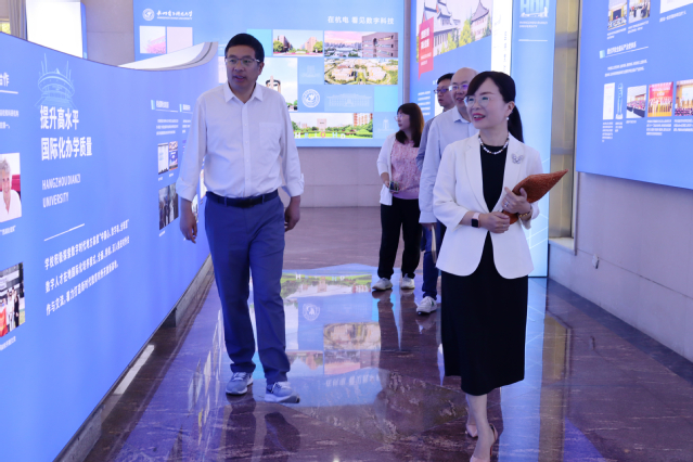 韩军一行结合我校的办学历史、党建特色、办学成果、文化建设等方面实地参观了省党建示范中心—我校党建智治中心、行政楼机关党委力行书屋、亚运击剑场馆,充分感受了杭电人“笃学力行、守正求新”和“国家大事、千万尽力”的精神面貌。