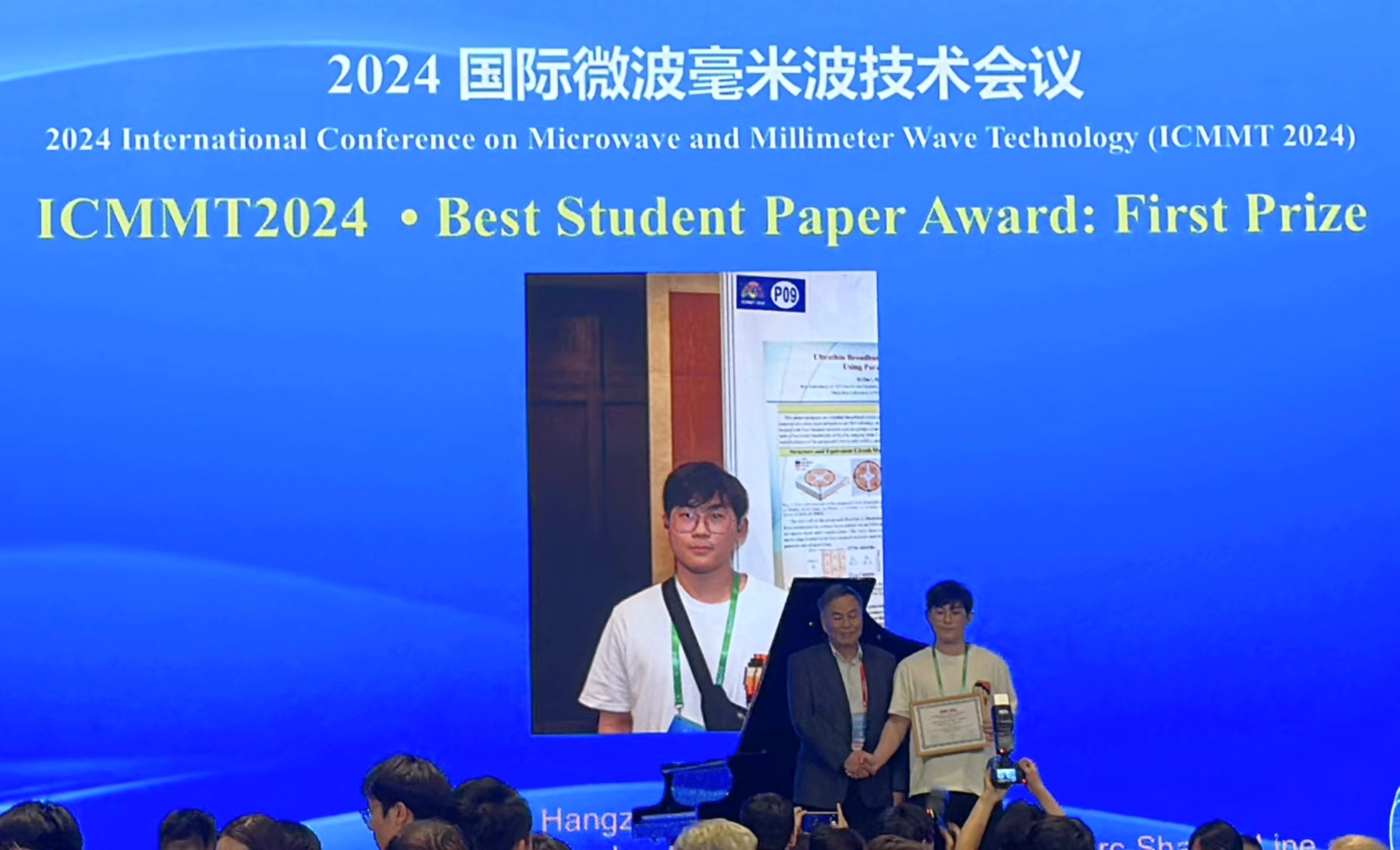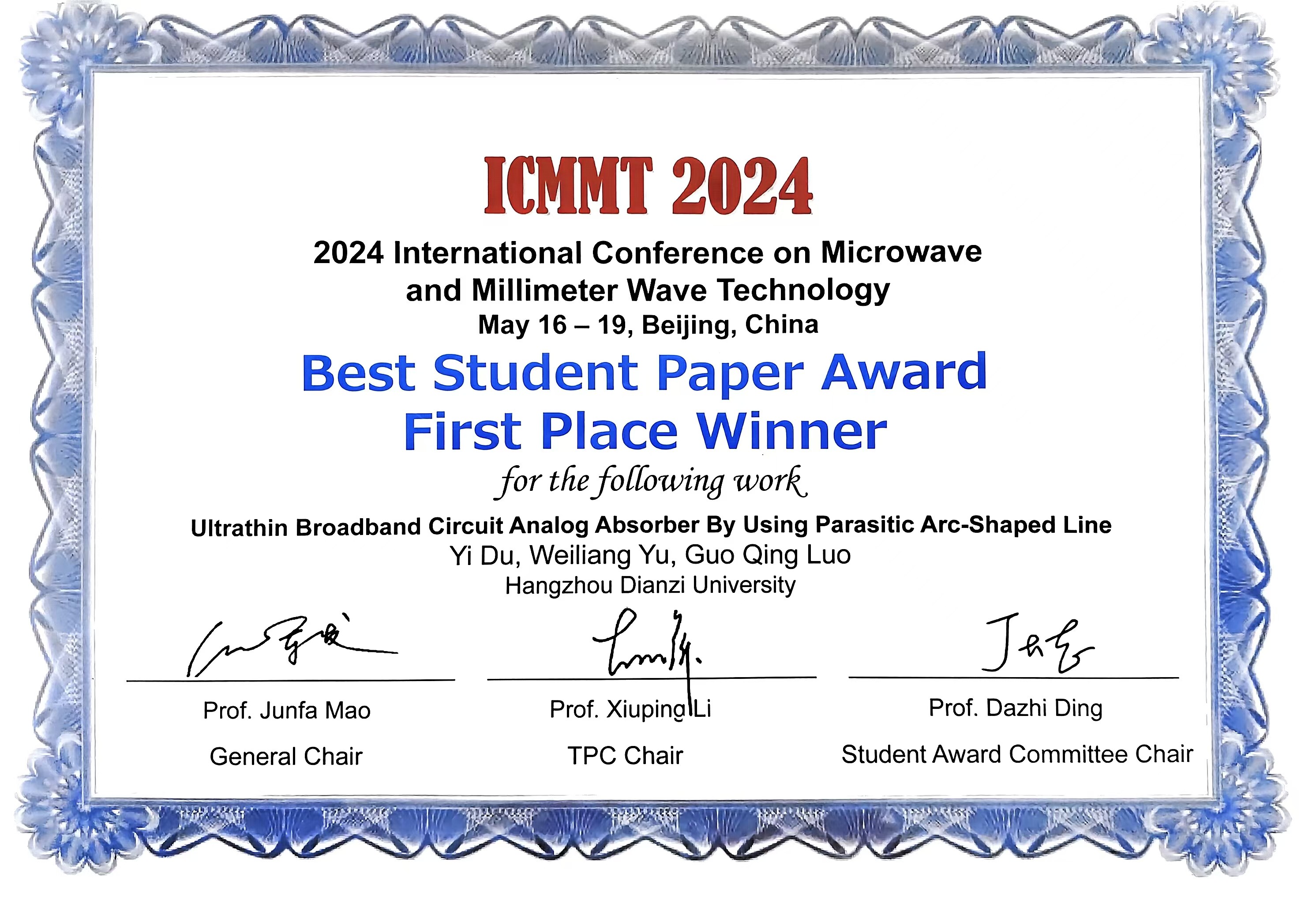 2024国际微波毫米波技术会议(2024 International Conference on Microwave and Millimeter Wave Technology, ICMMT 2024)作为本次中国微波周召开的三个中英文会议中参与度最高的会议,注册参会人员921人,录用论文873篇。我校电子信息学院罗国清教授课题组硕士研究生杜熠投稿的论文“Ultrathin Broadband Circuit Analog Absorber By Using Parasitic Arc-Shaped Line”最终从873篇论文中脱颖而出,经过网络初审和现场答辩两轮评审,以第1名的身份获得最佳学生论文奖,荣获本次会议的唯一的一等奖。