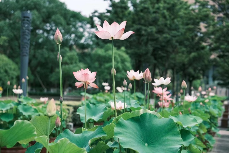 物业服务部精心种植了太空莲、紫冠、紫菀、蝶舞等热门品种的荷花600余盆,棵棵荷花都寄予后勤人对毕业生的祝福。为便于毕业生打卡拍照纪念,特意将荷花种植成盆栽景观并增加荷花摆放间距。同时还在生活区五餐厅前和教学区学生活动中心西侧开展顺丰和邮政特惠毕业生行李寄递服务。
