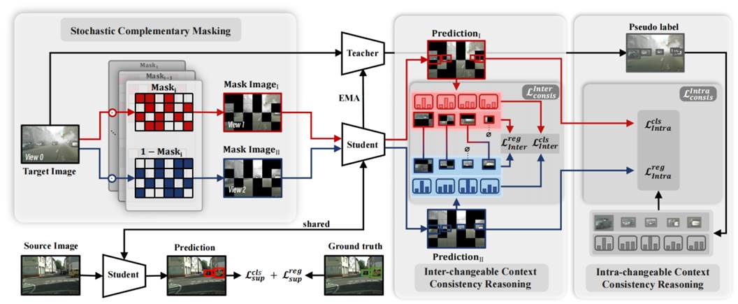 域适应目标检测(DAOD)旨在通过利用有标注的源域数据提高检测器在未标注的目标域的适应能力。近年来,采用自训练框架,使得学生模型能够利用教师模型生成的伪标签学习目标域的知识。尽管取得了显著成功,但这种类别级一致性监督受到伪标签质量差的影响。为了解决这一问题,我们提出了一种随机上下文一致性推理网络(SOCCER)。首先,我们引入了一种随机互补掩码模块(SCM),生成一对互补的掩码图像,从而防止网络过度依赖特定的视觉线索。其次,我们设计了一种可互换的上下文间一致性推理模块(Inter-CCR),构建了一个上下文间的一致性范式,通过对学生模型预测的互补掩码图像对进行双向对齐,捕捉目标域的纹理和轮廓细节。同时,我们开发了一种可互换的上下文内一致性推理模块(Intra-CCR),构建了一个上下文内的一致性范式,通过利用伪标签监督学生模型的预测,增强模型的上下文推理能力。在三项DAOD基准测试的实验结果表明,我们的方法在性能上大幅超越了当前最先进的方法,展现出优越的域适应能力。