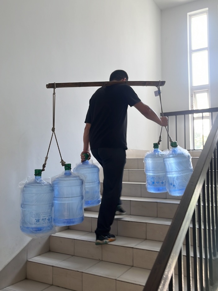 炎炎夏日,正是夏季用水高峰期,商贸服务部的送水师傅每日扛上20升的桶装水,一天有数不清的来回,汗水浸湿衣背,但是没有一句怨言,只为师生能尽快喝上甘甜的水。