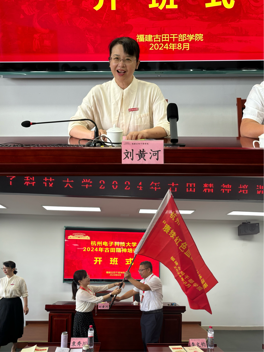 福建古田干部学院党委委员、副院长刘黄河向培训班授旗并致欢迎辞。她介绍了福建古田干部学院成立的发展历程和龙岩市的基本情况,分析了古田会议对于中国共产党思想建军、政治建军的重大意义,希望广大学员在学习期间能够深刻领悟古田精神的真正含义,做到学以致用、融汇贯通。