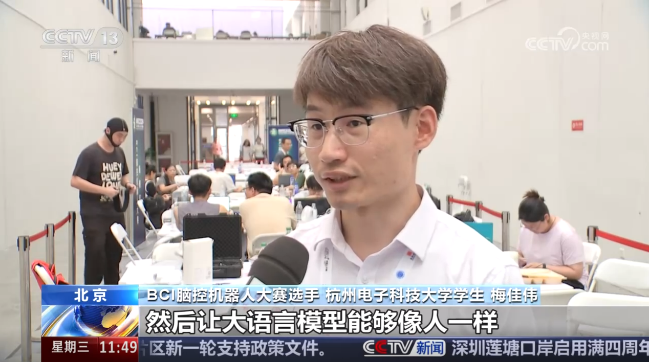 根据初赛成绩,全国共有18支队伍进入“MetaBCI创新应用开发赛项”决赛。由张建海教授和程世超副教授共同指导,研究生梅佳伟、王亦凡、陈雅琦和本科生陈凯乐、郑卓宸组成的Baseline队荣获一等奖。团队负责人梅佳伟接受央视新闻采访介绍团队的创新应用成果。该项目旨在应对心理健康服务的挑战,通过融入脑机接口与大语言模型技术,开发创新型心理咨询大模型。该系统优势在于能够通过在线分析脑电信号,精确洞察用户情绪状态,提供个性化、精准化的心理支持。