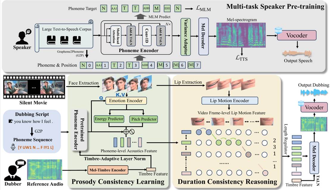 其中,论文《From Speaker to Dubber: Movie Dubbing with Prosody and Duration Consistency Learning》被会议选为Oral论文(Oral录用率3.97%)。该项研究聚焦于视觉声音克隆(Visual Voice Cloning,V2C),视觉声音克隆又称为电影配音任务(Movie Dubbing),旨在将台词转换为在时间和情感方面都与给定电影片段对齐的语音,同时保留住给定的单个参考音频的音色特征。配音中丰富的情绪和节奏变化以及需要和视频内容达成的对齐使其成为了一项极具挑战性的任务。该研究针对以上挑战设计了一个两阶段训练策略以及两个跨模态一致性模块,以使配音兼具高质量的发音和与视频内容的多层次对齐。