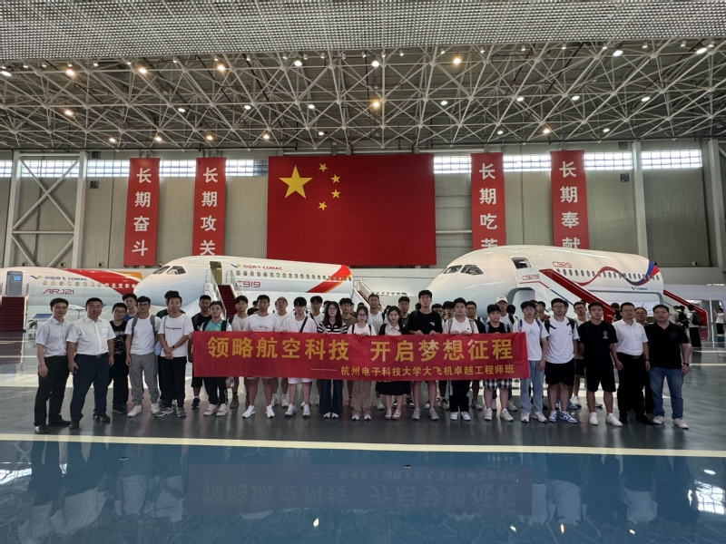 在讲解员的带领下,师生们参观了中国商飞十六年的发展历程及成果,了解已经投入使用的ARJ21新支线飞机、C919大型客机两大机型的设计研发过程,以及正在研发的C929远程宽体客机的设计发展理念,登上三种型号样机亲身体验机舱布局和驾驶舱先进技术,领略中国大型客机研发的重大成就。