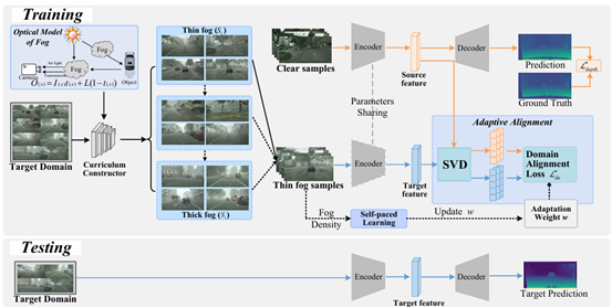该研究主要关注恶劣天气条件下的深度图预测。在现实环境中,受雨雾等环境因素导致的能见度降低影响,正常条件下训练的模型在恶劣天气下将无法准确预测物体的深度信息。为解决这一问题,该研究提出通过课程域分布对齐算法,在特征空间渐进的对齐正常天气和恶劣天气的数据分布以学习跨域共享的深度特征。为了实现由易到难的数据分布对齐,该研究将恶劣天气数据按能见度由高到底构建为多个子集,并学习一个动态权重控制分布对齐的进程。为了实现数据跨域分布对齐并保持特征尺度,奇异值分解被引入解耦尺度无关的特征向量,并通过特征子空间主角对齐减小跨域数据分布差异。