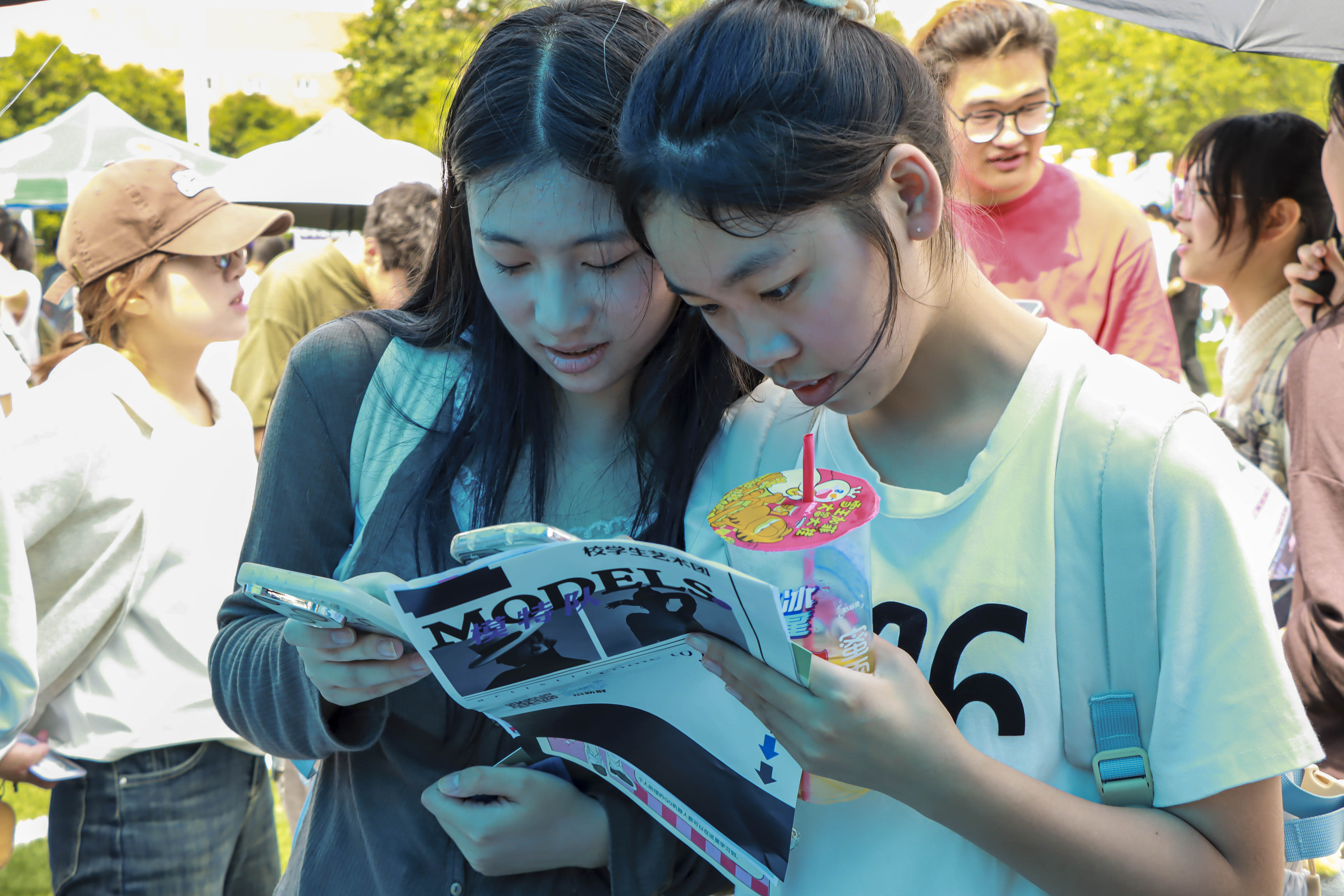 五色海报应接不暇齐上阵,十方社团争奇斗艳揽新人。德育为先,厚德载物,突出价值引领。思想联盟把多本经典理论著作摆在案头,用学理魅力召人驻流,国旗护卫队、国防协会精神抖擞,严守纪律又不失生机勃勃,英姿飒爽而难掩青春活力;智育为重,启智育人,尽显数字赋能,科创联盟社团纷纷展出学生科协(含学院科协)、水下机器人、航模队等科技作品,以科幻为翼,逐科学之梦,天文爱好者协会在摊位前摆起了天文望远镜,用静谧星空引人遐想翩翩;体育为基,体韵风华,注重强心健体。跆拳道社、剑道社等体育联盟社团架起擂台,模拟比赛现场;弈天棋社另辟蹊径,一本书,一盘棋,在喧闹中安静等待有缘人的加入;美育为要,美蕴交融,陶冶品质情操。大学生艺术团中爱E乐团、乐雅民乐团、合唱团、悦音歌队、留声剧社、越州戏曲社、清影舞队等“先声夺人”,古今器乐纷纷在形象展示区登场,舞袖翻飞,古典舞民族舞齐亮相,群星闪耀;说唱社、Setfree等音乐舞蹈类社团唱跳俱佳,民谣与说唱的碰撞、街舞与现代舞的摩擦,与时代同频,向梦想出发;劳育为本,以劳塑人,强化知行合一。国学社制作手工品、刀画油墨社现场作画,青年志愿者协会(含学院青协)、红十字会等公益联盟社团传递和普及志愿精神,引导同学们在实践服务中奉献自我。