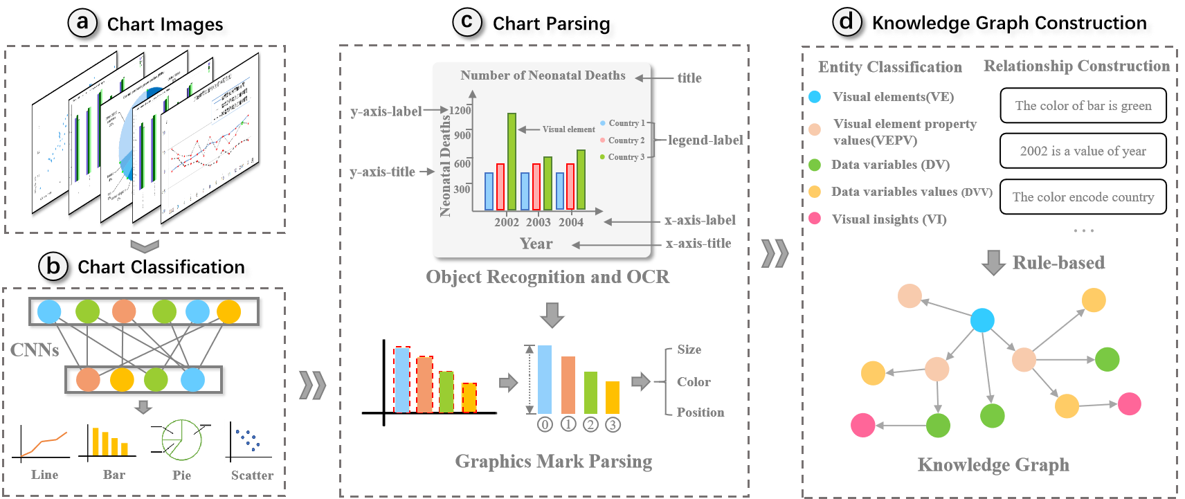 大数据时代,可视化技术的广泛应用催生了海量的图表数据,经典的图表数据包括条形图、饼图、折线图等。面向海量的图表数据,从中提炼和获取有价值的信息,对于提升图表知识工程、大模型应用、智能检索、问答等下游任务具有重要意义。然而,现有的图表知识挖掘方法专注于将图表转换为原始数据,忽视了其视觉编码与高级语义信息,容易导致重要信息缺失,从而降低图表下游任务的成效。本文提出了一种结构化的图表知识表示方法ChartKG,能够统一建模图表中的视觉元素及其语义关系,并集成一系列图像处理技术,实现图表知识结构的自动抽取,为图表问答、图表检索和大模型的图表应用提供了高效的数据支持与知识解析。相关研究工作得到了国家自然科学基金与之江实验室开放课题的支持。