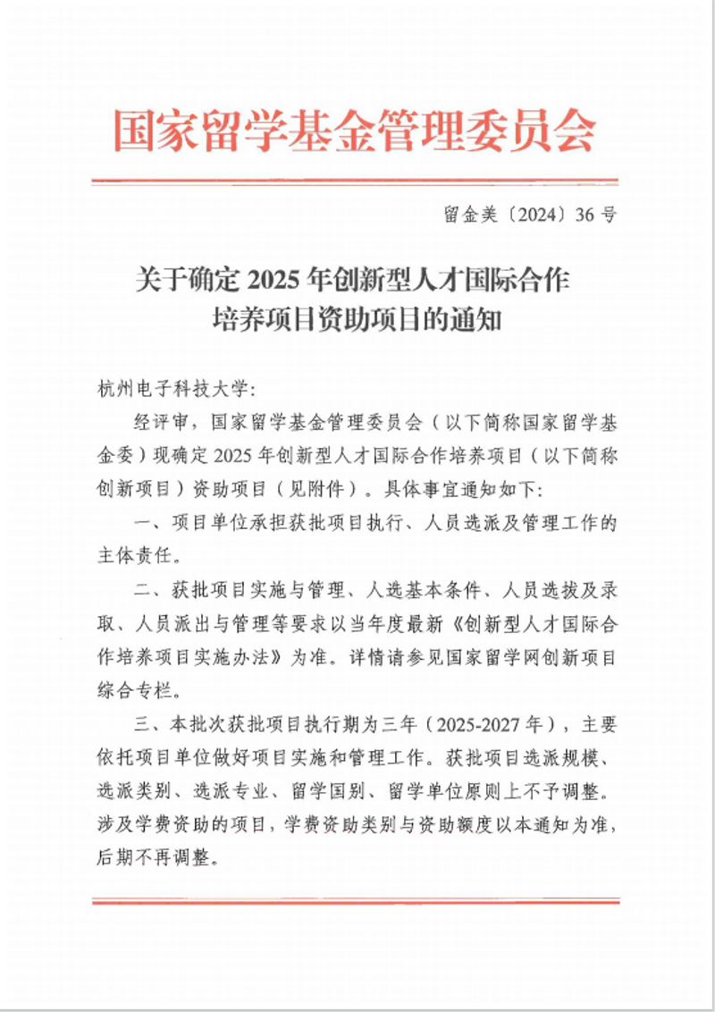 近日,国家留学基金管理委员会(以下简称“留基委”)公布了《关于确定2025年创新型人才国际合作培养项目资助项目的通知》,杭电圣光机联合学院申报的“久久精品一区二区与圣彼得堡国立研究型信息技术、机械与光学大学‘信息技术与智能系统工程’国际合作项目”成功获批。