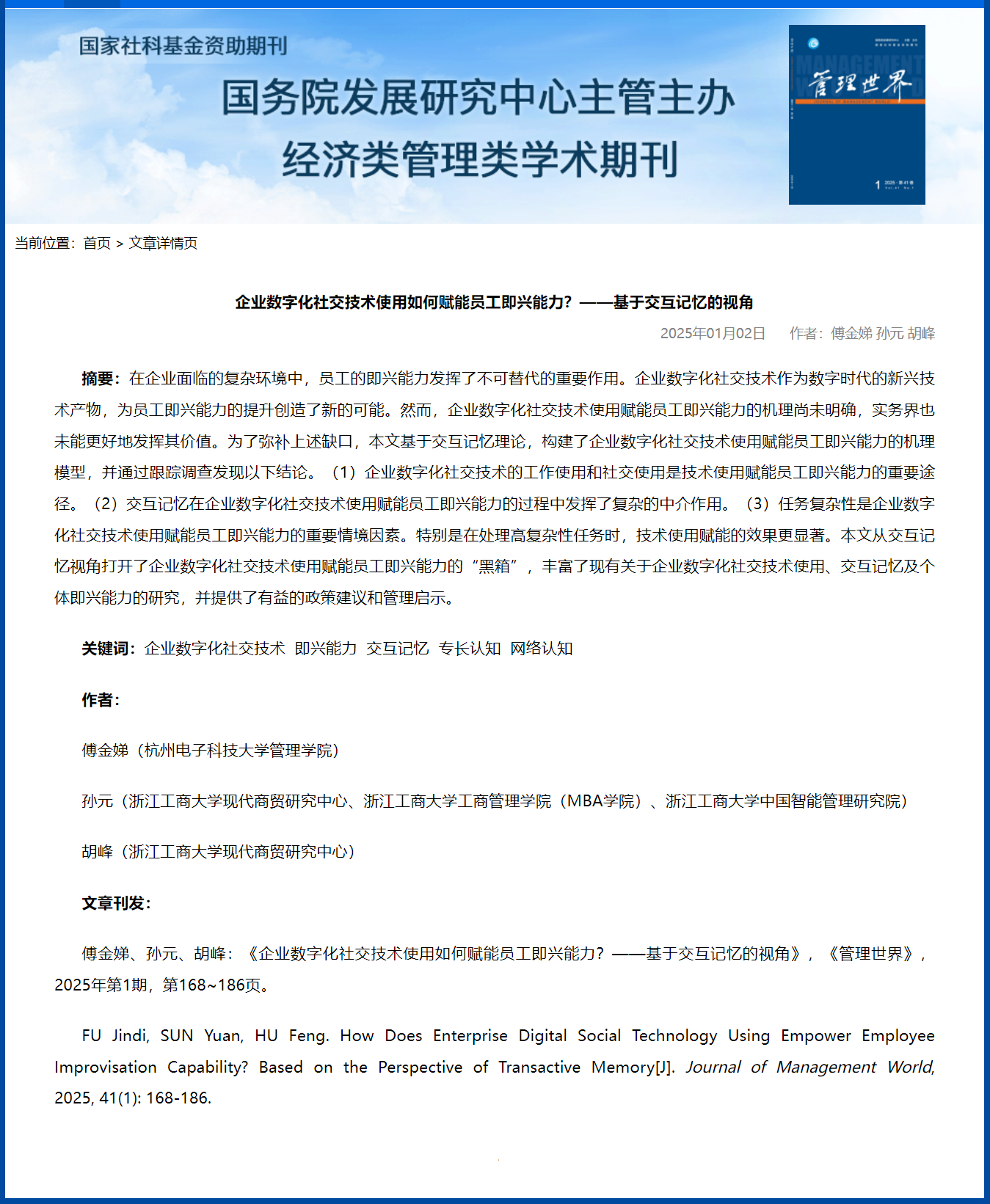 近日,管理学院傅金娣教师为第一作者的学术论文《企业数字化社交技术使用如何赋能员工即兴能力?——基于交互记忆的视角》在《管理世界》2025年首期正式发表。