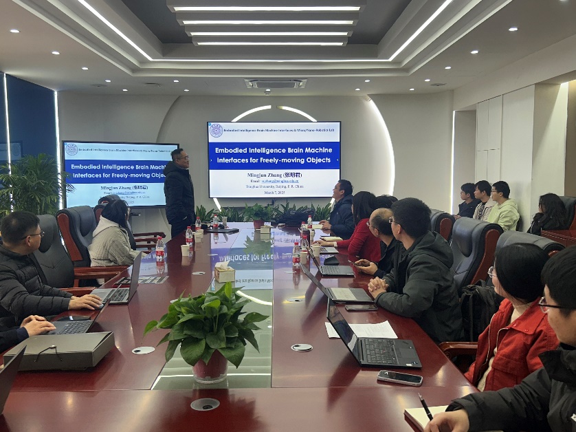 现场气氛热烈,参会教师和学生积极讨论,围绕脑机接口如何提升人机交互效率、具身智能的实际落地场景等问题展开深入交流。张明君耐心解答,并鼓励同学们积极投身该领域研究,不断突破技术壁垒,为未来智能社会的发展贡献力量。他还和参会教师深入讨论了脑机接口领域未来的发展趋势,并对科研选题进行了指导,为后续双方进一步深入合作奠定了基础。