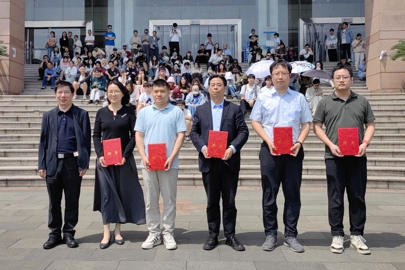聘任仪式上,戚明钧为人艺数法学院韩建民教授、材环学院王雅新教授、网络空间安全学院王帅教授、计算机学院余宙教授、通信工程学院江劭玮教授颁发文化大使的聘书。