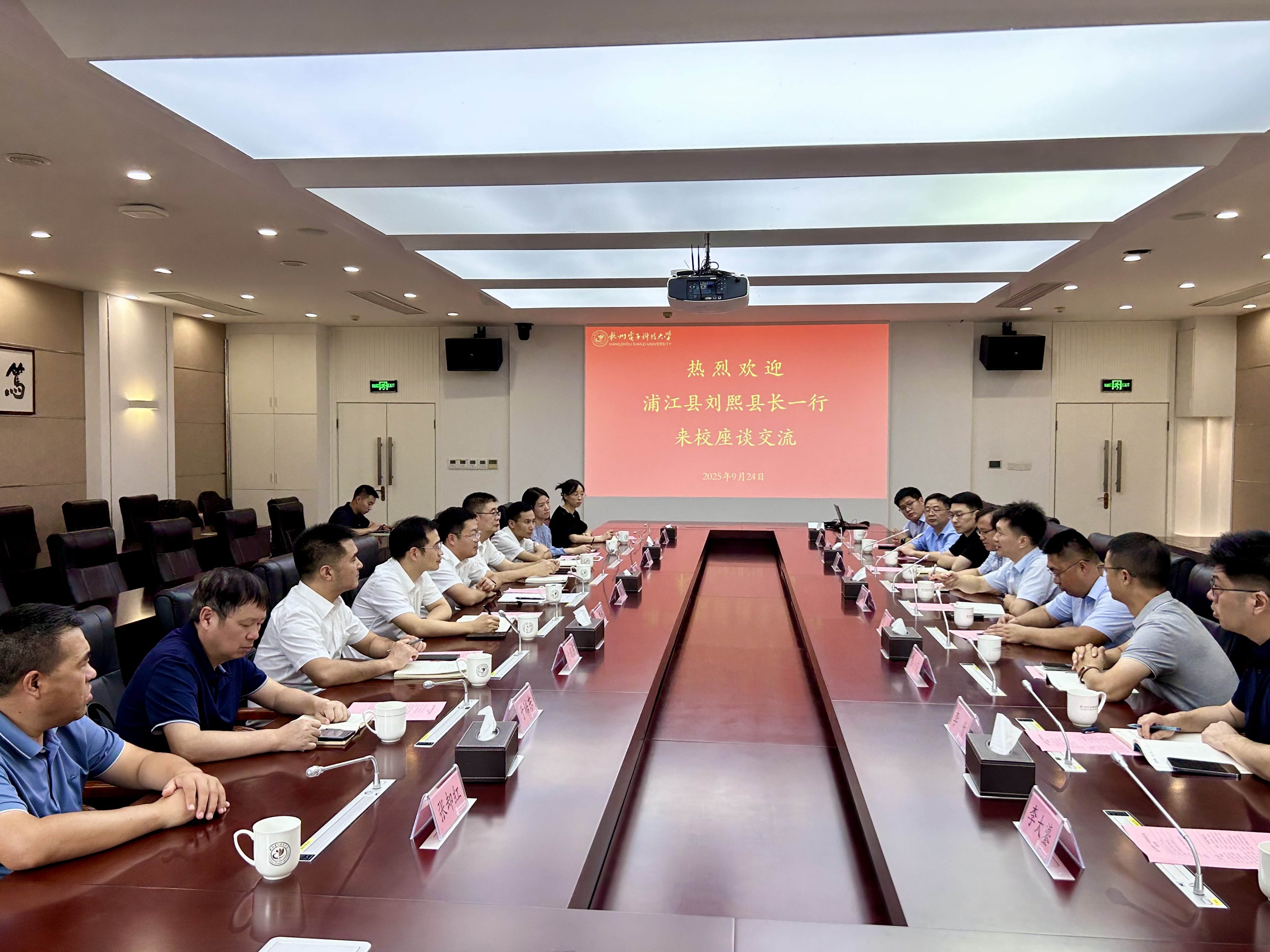 9月24日下午,浦江县委副书记、县长刘熙,副县长郑燎原、组织部长王甲元等一行9人来我校调研,双方就深化校地合作、进一步做强做好杭电浦江微电子与智能制造研究院建设等事宜展开深入交流。校党委委员、副校长颜成钢出席座谈会。校产学研融合发展中心、资产经营公司、人事处、电子信息学院等相关职能部门、学院负责人参加座谈。