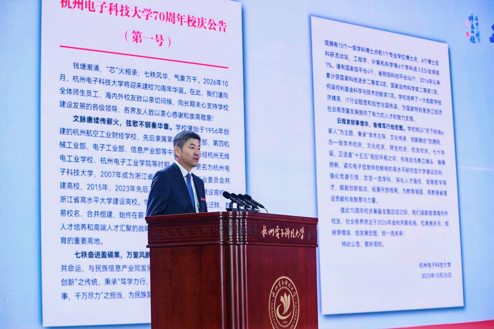 云程发轫事增华,奋楫笃行绘宏图。学校将以“天下杭电e家人”为主题,秉承“学术主导、文化传承、创新融合”的原则,办一场学术校庆、文化校庆、师生校庆、校友校庆。七十华诞,正适逢“十五五”规划开局之年,杭电自当勇立潮头、奋楫扬帆,紧扣电子信息特色鲜明的高水平研究型大学建设目标,强化党建引领,攻坚一流学科,深化人才强校,培育数字英才,赋能创新驱动,拓展开放格局,为教育强国、高教强省建设贡献杭电智慧与力量。